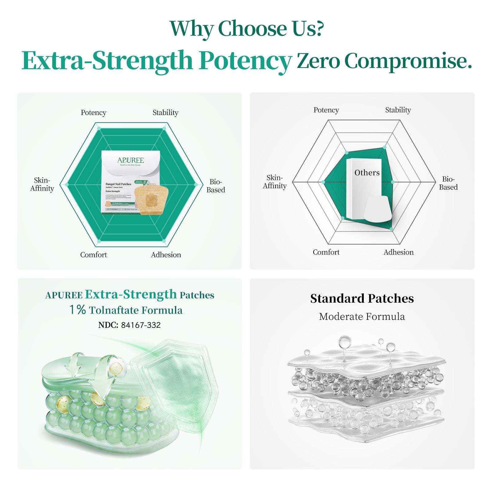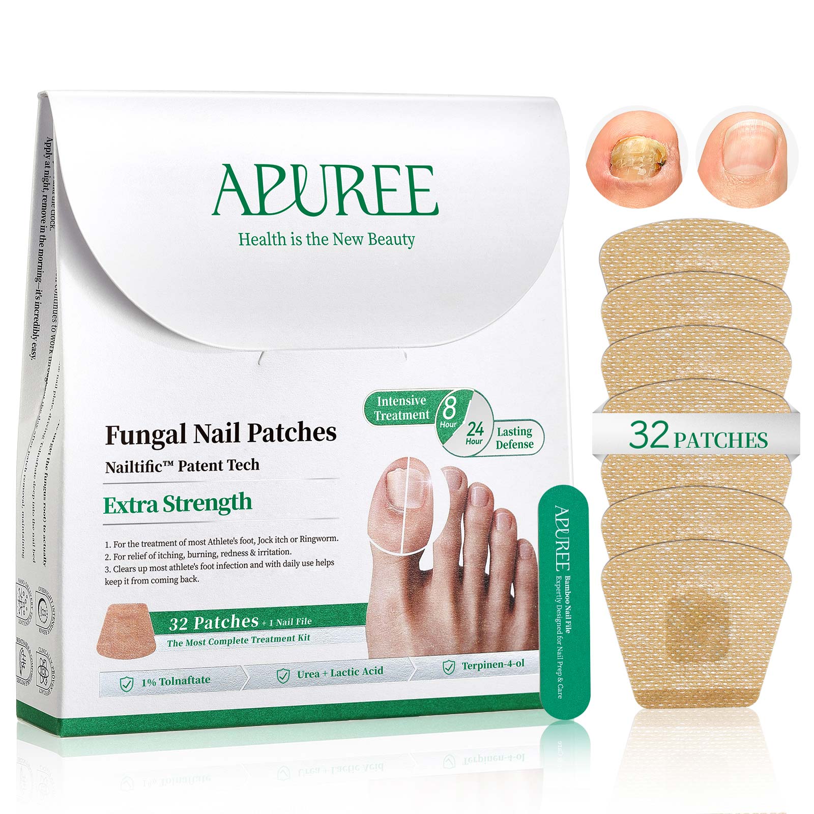 Struggling with damaged, thick or discolored nails? Apuree nail renewal patches utilize a high-potency 1% Tolnaftate formula and a deep-delivery system to tackle nail concerns and revitalize your nails from within.