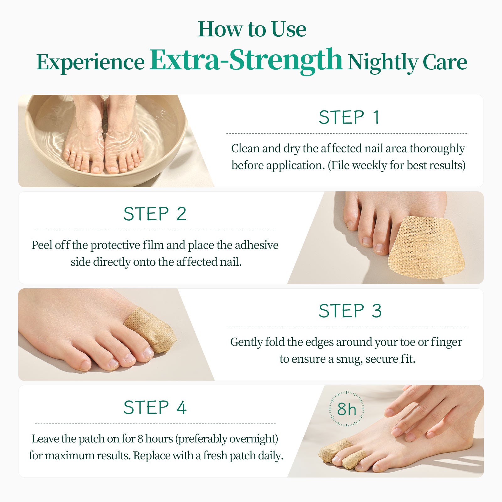 - Apply: Press patch firmly over the nail before sleep.